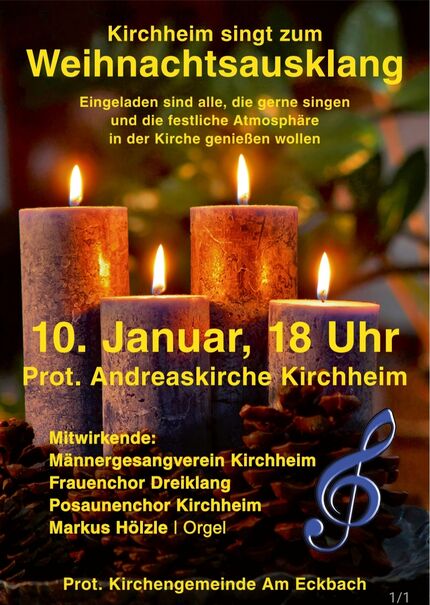 Die Weihnachtszeit endet nicht mit den Feiertagen, sondern wird im kirchlichen Kontext bis Maria Lichtmess, am 2.Februar, angesehen. Deshalb gestaltet die Prot. Kirchengemeinde mit uns und weiteren Gruppierungen einen musikalischen Weihnachtsausklang. Wir hoffen, viele Menschen in der Kirche zu begrüßen, die mit uns singen.